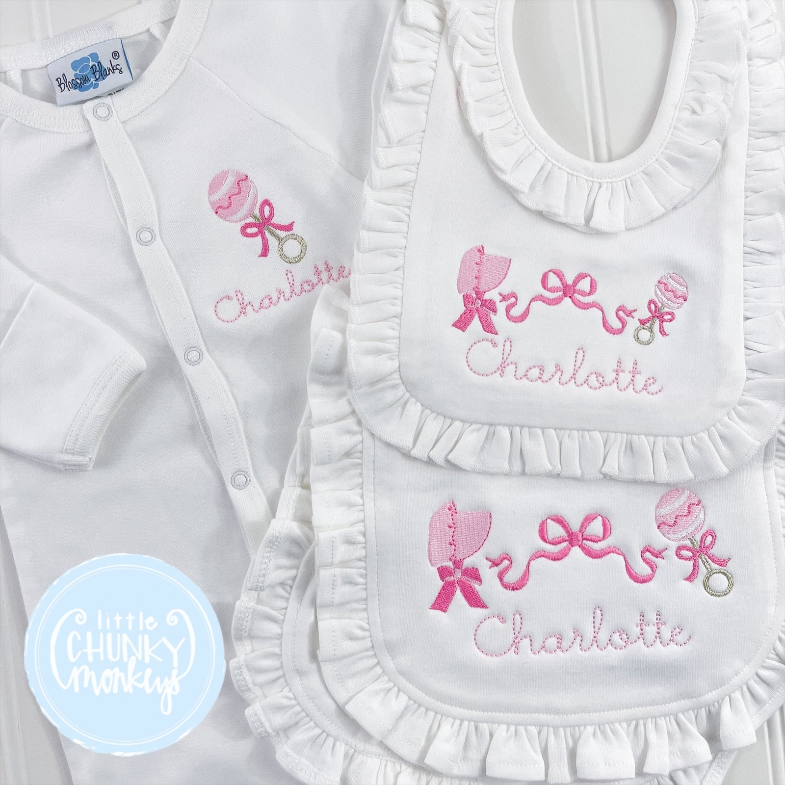 Bonnet, Bow & Rattle Bib or Burp Cloth