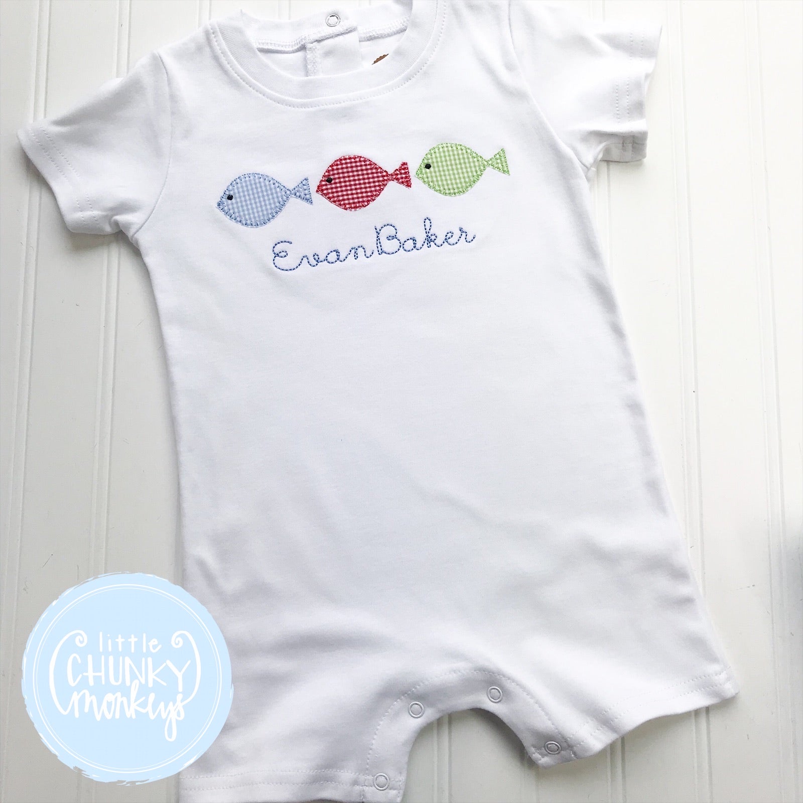 This sweet design is perfect for vacations and everyday wear. It features a small school of fish in the sweetest gingham color combination on a white romper.