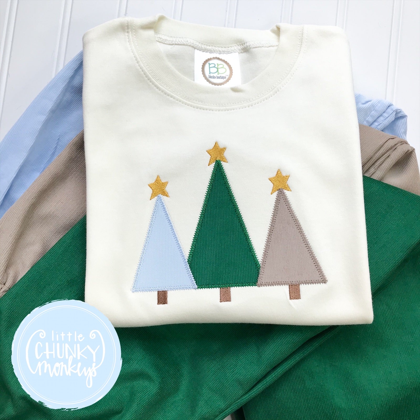This shirt is perfect for all christmas activities. It features an applique trio of Christmas trees with corduroy fabric. The stars can be left off to get wear all winter long.