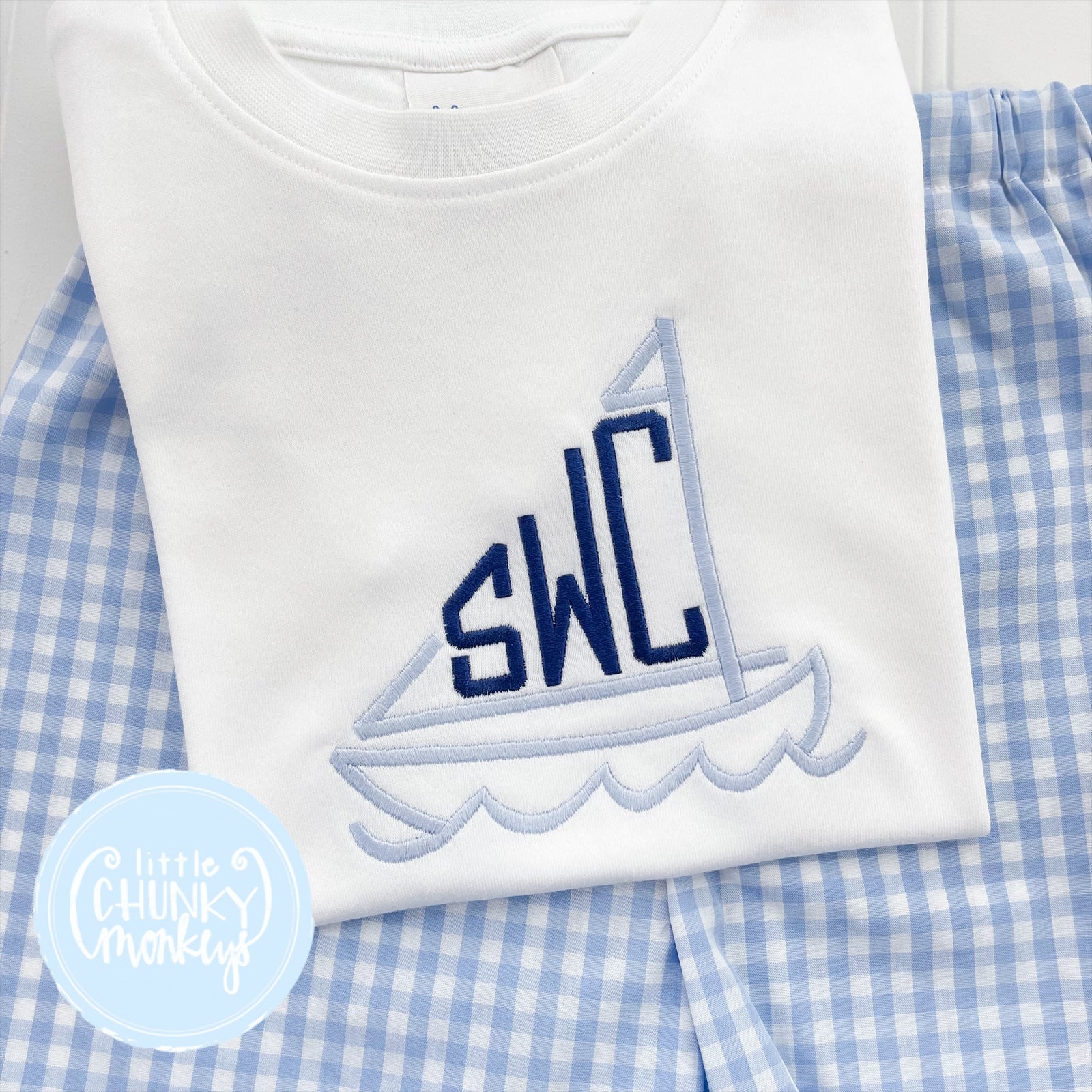 This sweet shirt is perfect for your transportation loving little one. It features a sailboat monogram on light blue & navy.