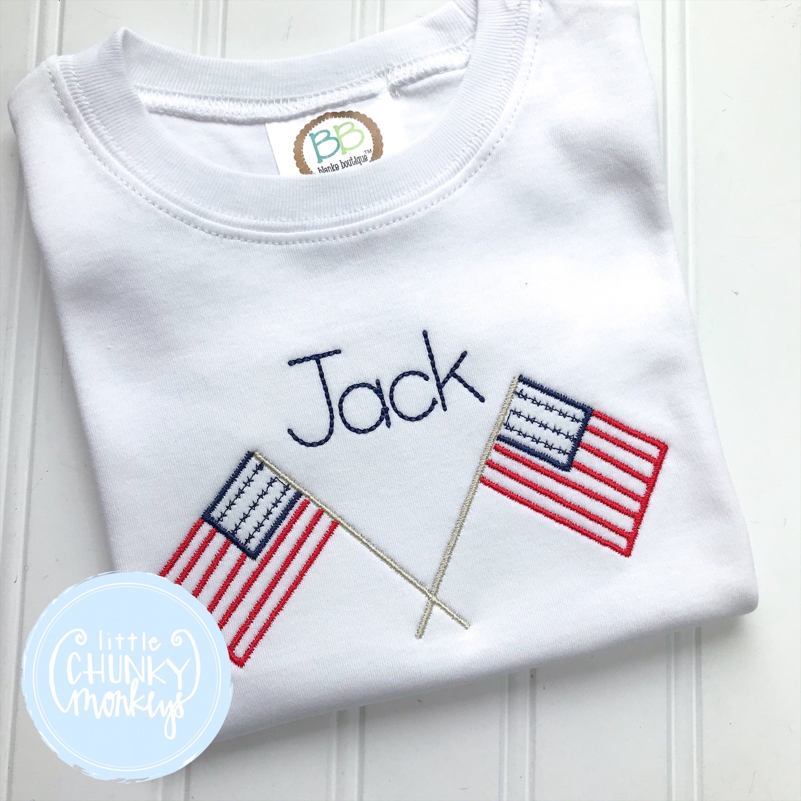 This simple shirt is perfect for patriotic holiday wear. It features American flags with personalization.