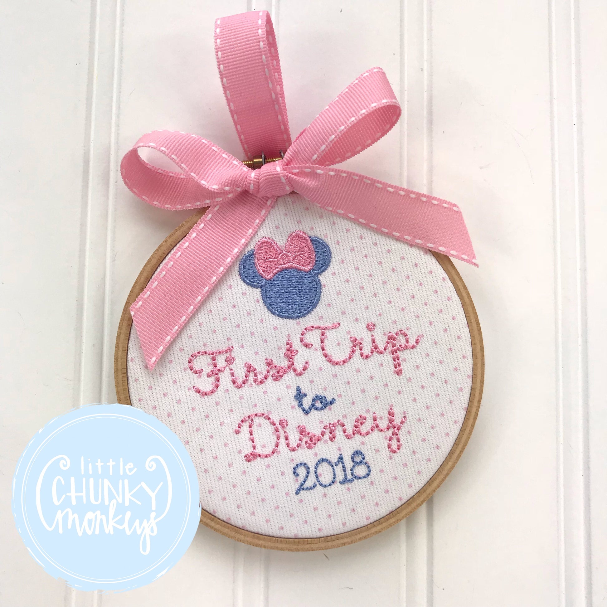 Featured is a Minnie with Bow with "First Trip to Disney" What a magical time and a little remembrance each year.