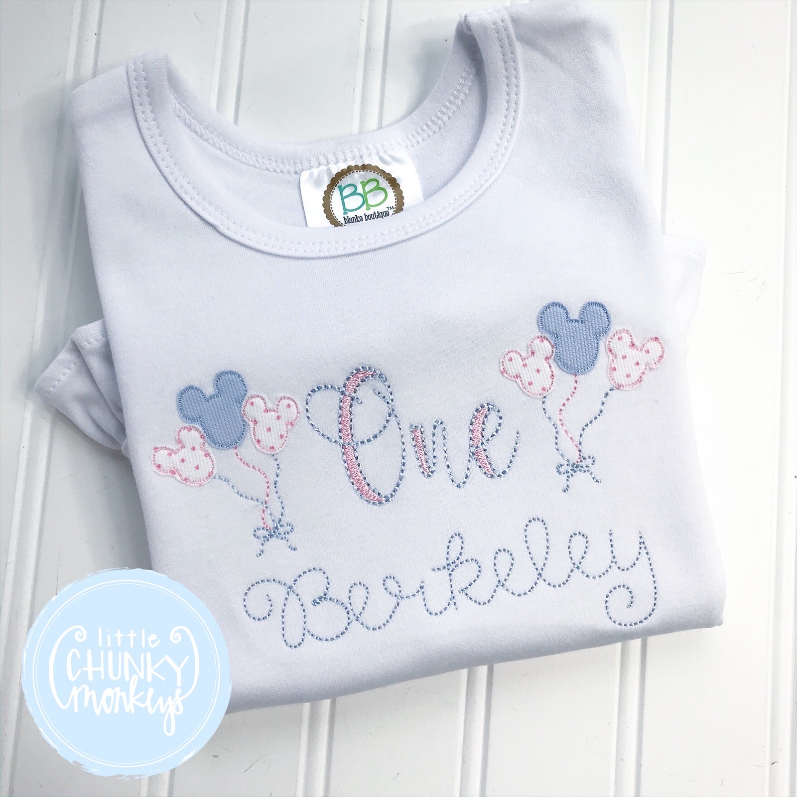 This shirt is sure to be a girl favorite! It's perfect for parties. It features applique mini mouse balloons with a a a stitched "one". This can also be done for boys, please specify in comments colors and number that needs to be stitched.
