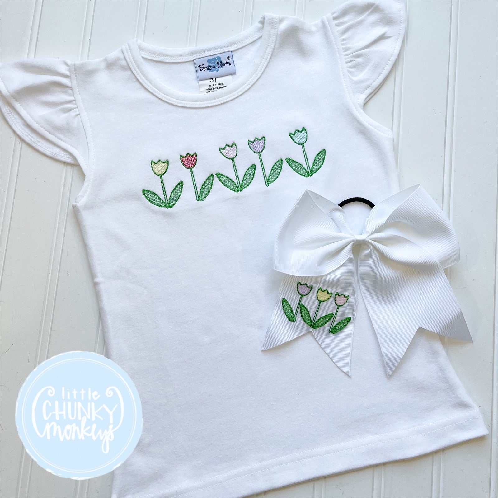 This sweet shirt is perfect for spring and year round wear. It features the sweetest sketch tulips.