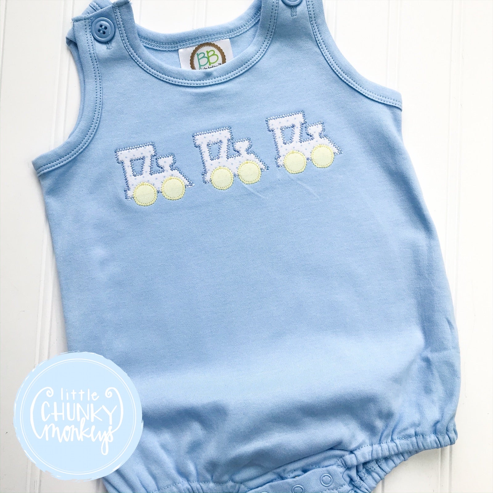 This sweet light blue sun bubble features the sweetest train trio in blues and yellows.